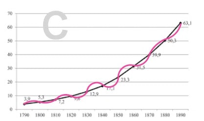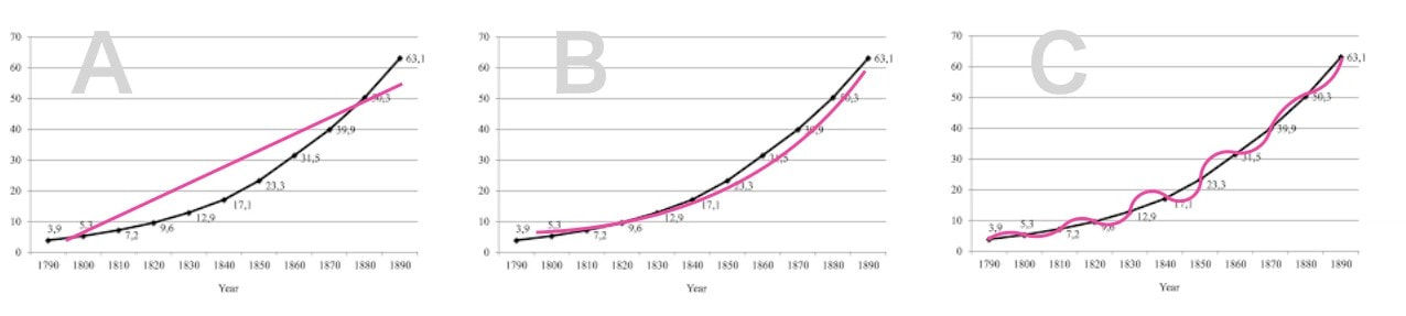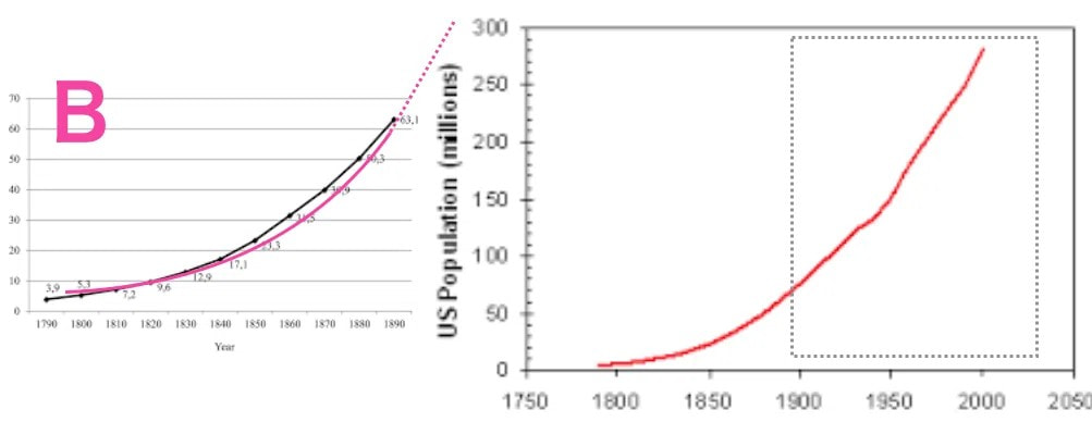 たとえば、1800年から1900年までの人口増加データを見て、将来を予測するとしよう。