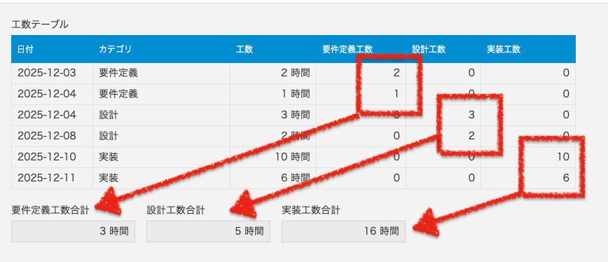 それぞれ行の「要件定義工数」「設計工数」「実装工数」のフィールドはもし邪魔であればプラグインを使って非表示にすることができます。そうすれば隠しフィールドみたいに扱うことができて見た目もスッキリします。