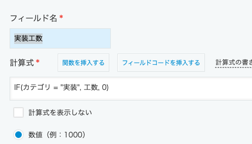 例えば「カテゴリ」のプルダウンで「実装」が選択された行の工数を「実装工数」として出すことを考えます。