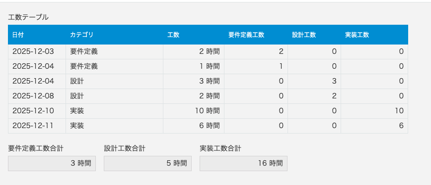 要件定義、設計、実装などのカテゴリを指定して工数を記録できるテーブルです。