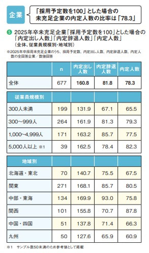 出典:就職白書2025/P21「2025年卒未充足企業「採用予定数を100」とした場合の「内定出し人数」「内定辞退人数」「内定人数」」